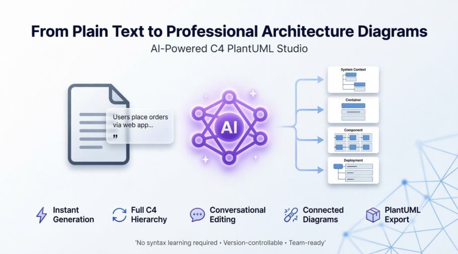As someone who has spent years wrestling with software architecture documentation—from clunky Visio files to fragmented Miro boards—I’ll admit I was skeptical when I first heard about an AI tool that could “turn plain English into professional C4 diagrams.” The promise sounded too good to be true: describe your system, click a button, and watch a standardized, navigable architecture map appear.