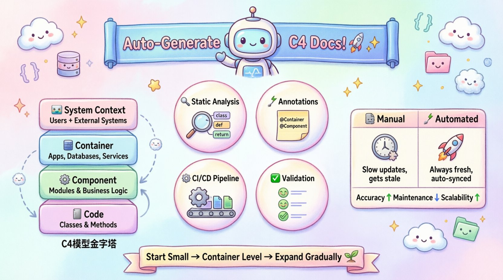 Software architecture diagrams often become outdated shortly after creation. This phenomenon, known as documentation rot, creates a gap between the written plan and the actual system. Teams spend hours manually updating diagrams only to find them stale again by the next sprint. The C4 Model offers a structured approach to visualizing software architecture, but relying on manual drawing tools for every change is unsustainable at scale. Automation bridges this gap. By integrating generation processes into the development lifecycle, organizations maintain accurate, up-to-date visual documentation without sacrificing engineering velocity.